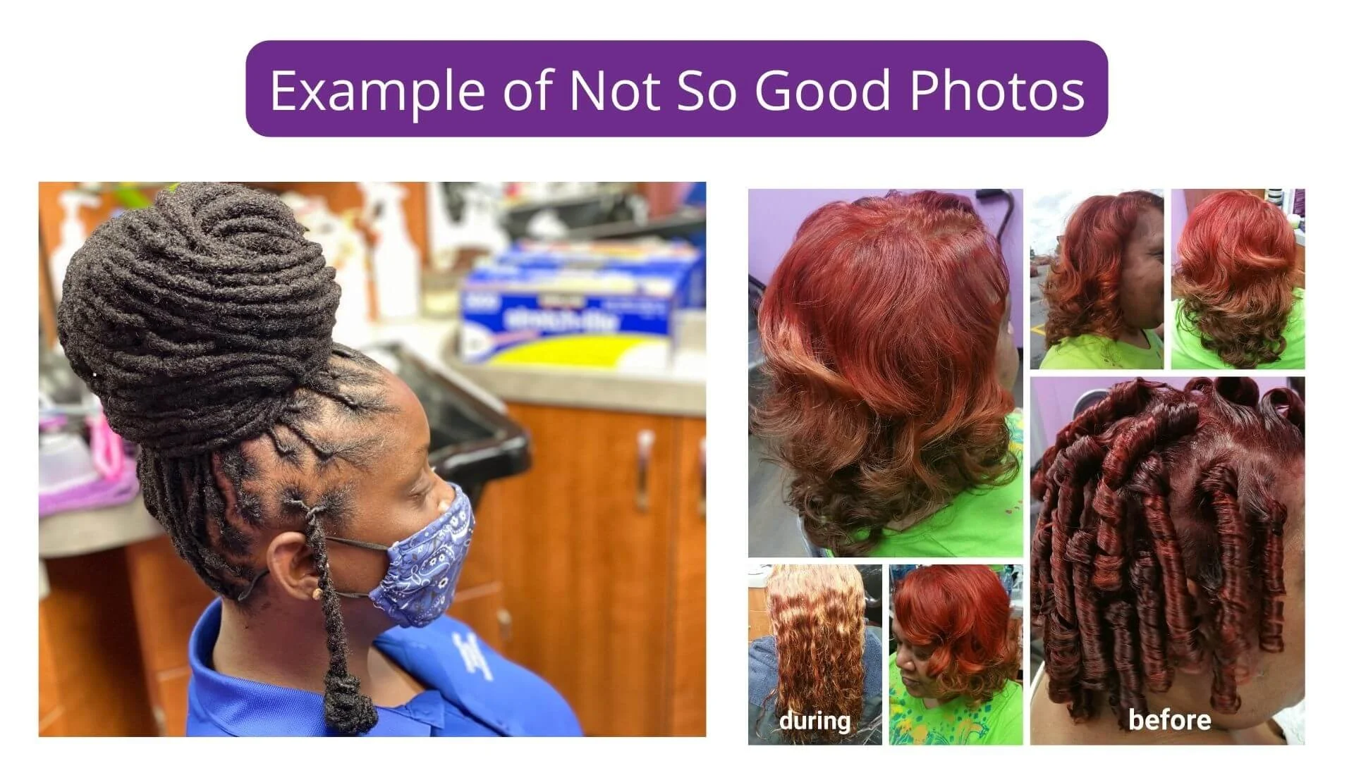 Now, I’ve been doing hair for around 15 years, and imagine if all my work looked like the collage at top of this post on the right. Not in 2023, bay-bee! So when trying to present yourself to the world, make sure that you have a clear photo that details your work, have good lighting, and make sure your clients are having fun with you while doing it.